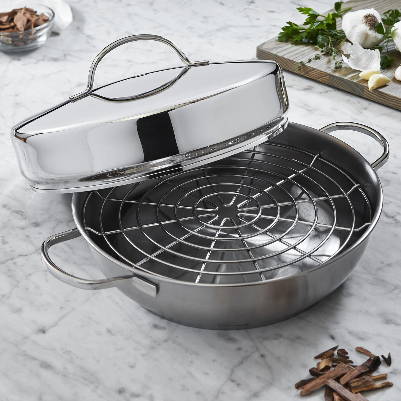 De pan is gemaakt van kwalitatief roestvrij staal en voorzien van een bodem die de warmte goed geleidt. Op elk fornuis, ook inductie. De rookkamer werd zo geperforeerd dat ze de rook vlot doorlaat én beschermd is tegen afdruipend vet en vocht. Samen met het stoomrooster zorgen ze dat jouw ingrediënten die intense, karakteristieke rooksmaak krijgen. Wanneer je het deksel wegneemt, komt er wat rook en aroma vrij. Daarom doe je dat best onder de afzuigkap.